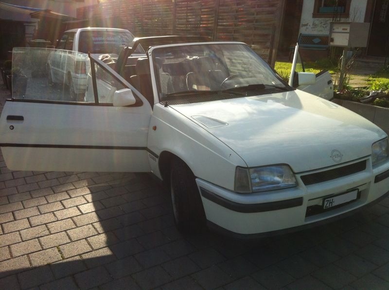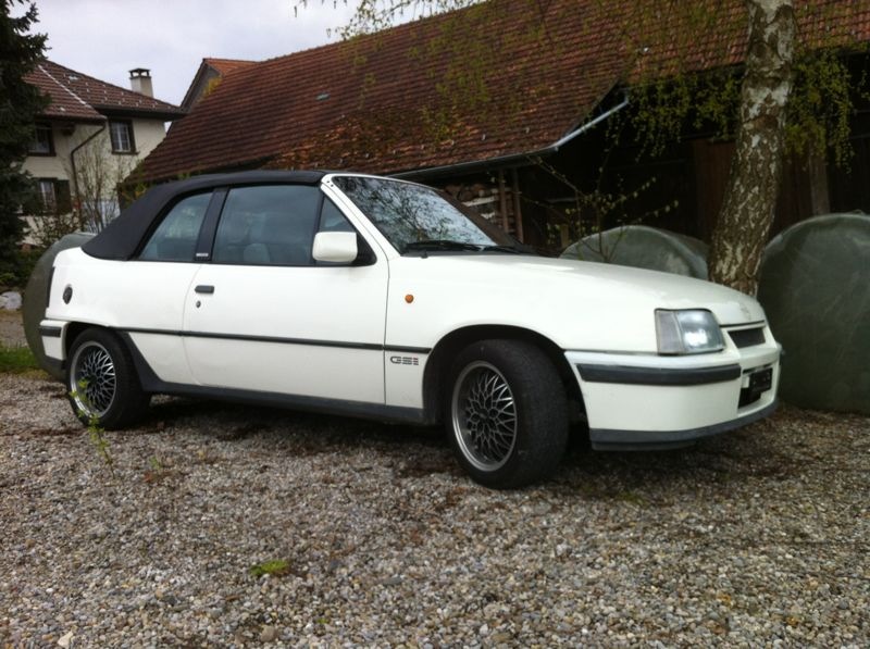 Rechts finden wir ein jüngeres aber ungleich selteneres Stück, einen Kadett GSi Cabriolet. Er mags gerne sportlich und ist noch nach alter Opelmanier schnell geworden; durch den Einbau eines Motors der grossen Modelle. In diesem Falle ist das ein 2 Liter mit 115PS.