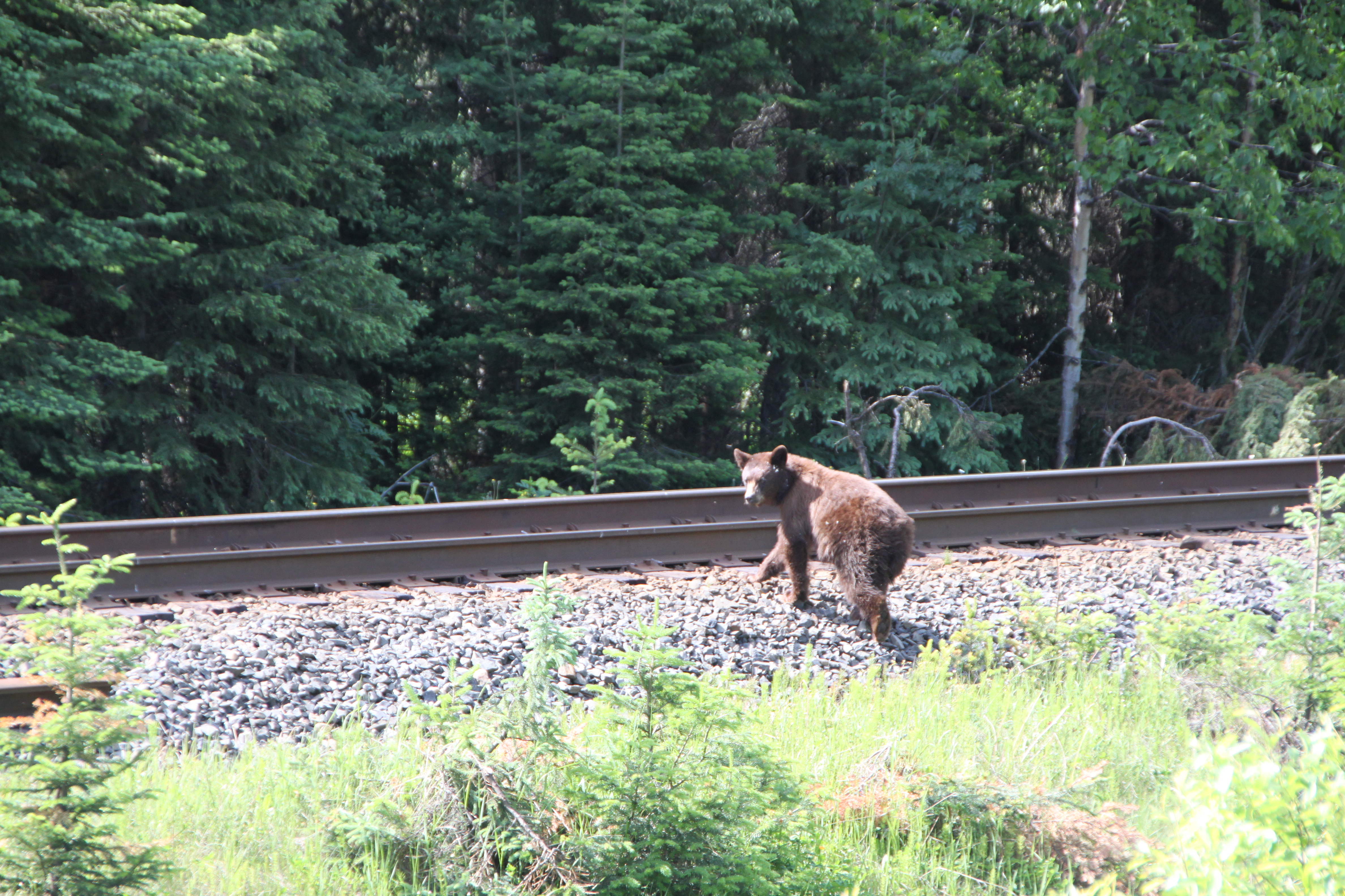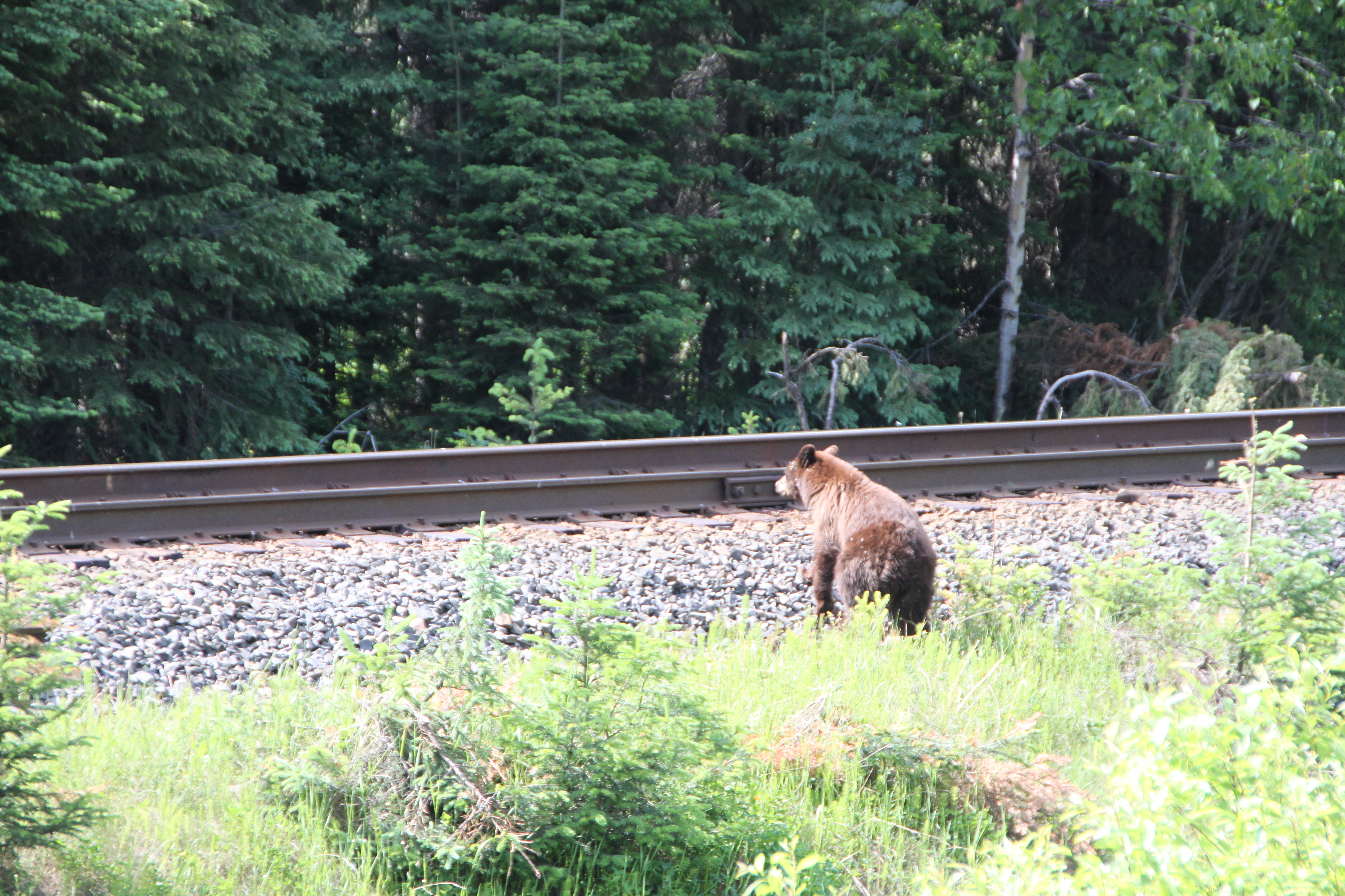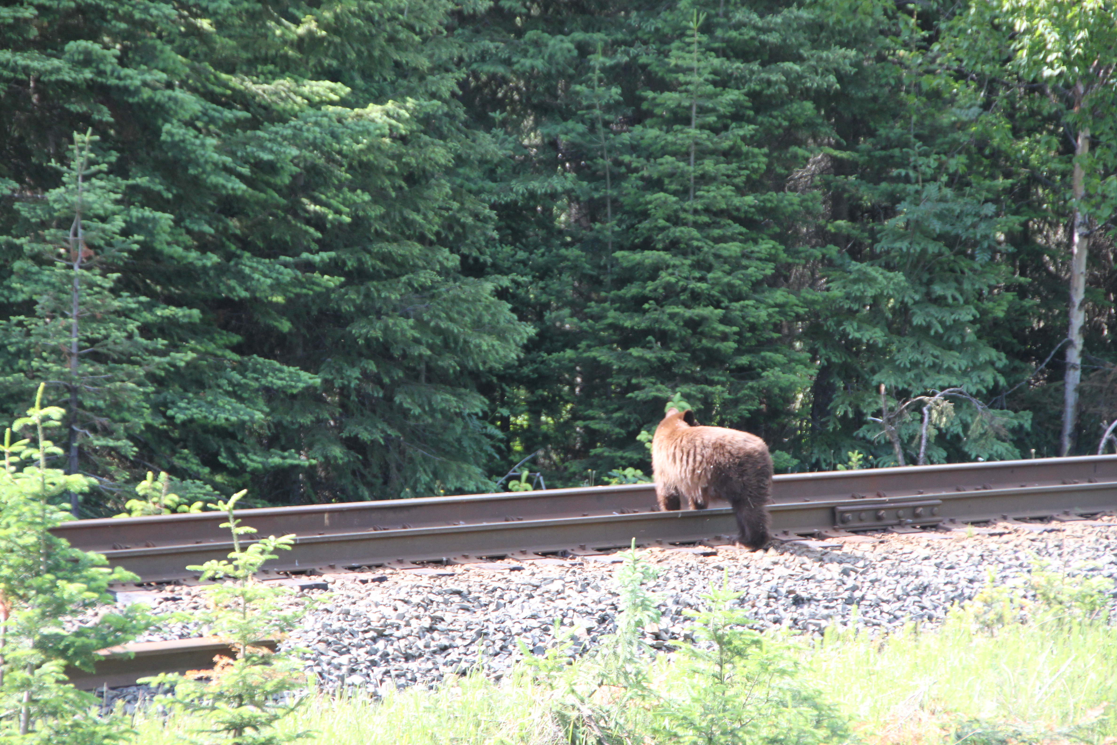 Unterwegs Richtung Jasper Nationalpark erspähen wir Meister Petz. He Sie, das Überschreiten der Geleise ischt verboten!