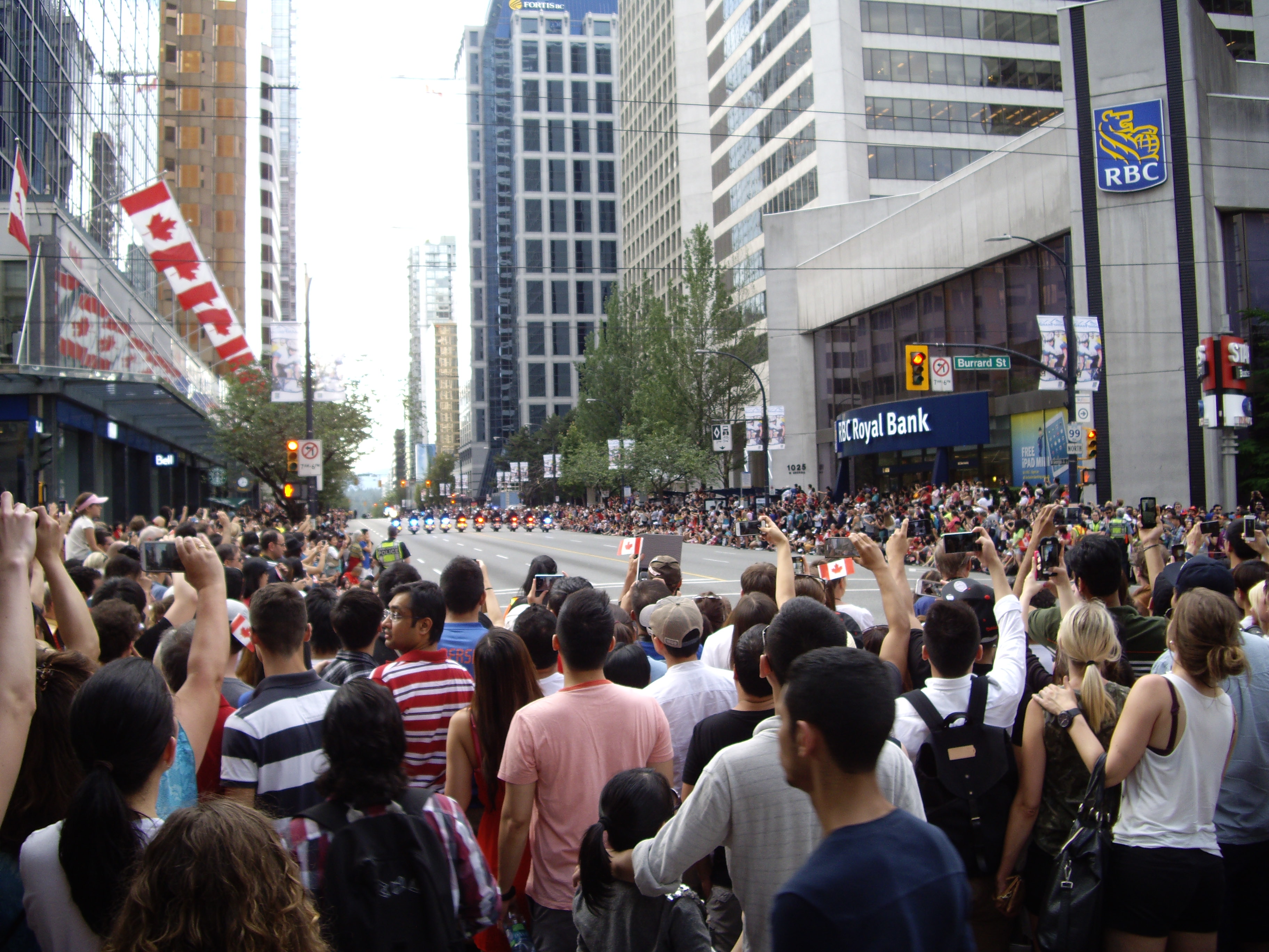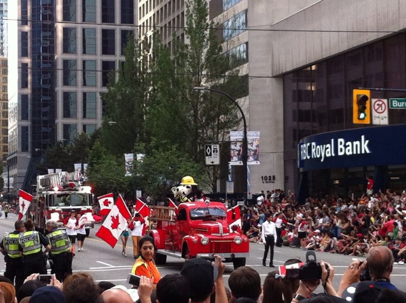 Unbedarft wie wir sind, kommen wir nach Vancouver am Canada Day, am July 01 um es landestypisch wiederzugeben. Kein Vergleich zum 03. Oktober in Deutschland, der zwar von der Obrigkeit verordnet und gefeiert wird aber dem Volk eher einen willkommenen zusätzlichen Freitag gibt. Zu vergleichen ist dieser kanadische Nationalfeiertag eher mit dem „quatorze juillet“ in Fronkraisch oder eventuell noch mit dem 01. August dem Nationalfeiertag in der Schwyz. Es herrscht ausgelassene Feststimmung und JEDER schwenkt stolz ein Kanadafähnli. So viel Integrationswillen von allen Migranten wünscht man sich zeitweise auch in Europa. Paraden gehören natürlich auch zur Fete und Pozilei und Feuerwehr geben sich ein Stelldichein. Natürlich ist das alles viel Show, aber der gesunde Patriotismus lebt 🙂