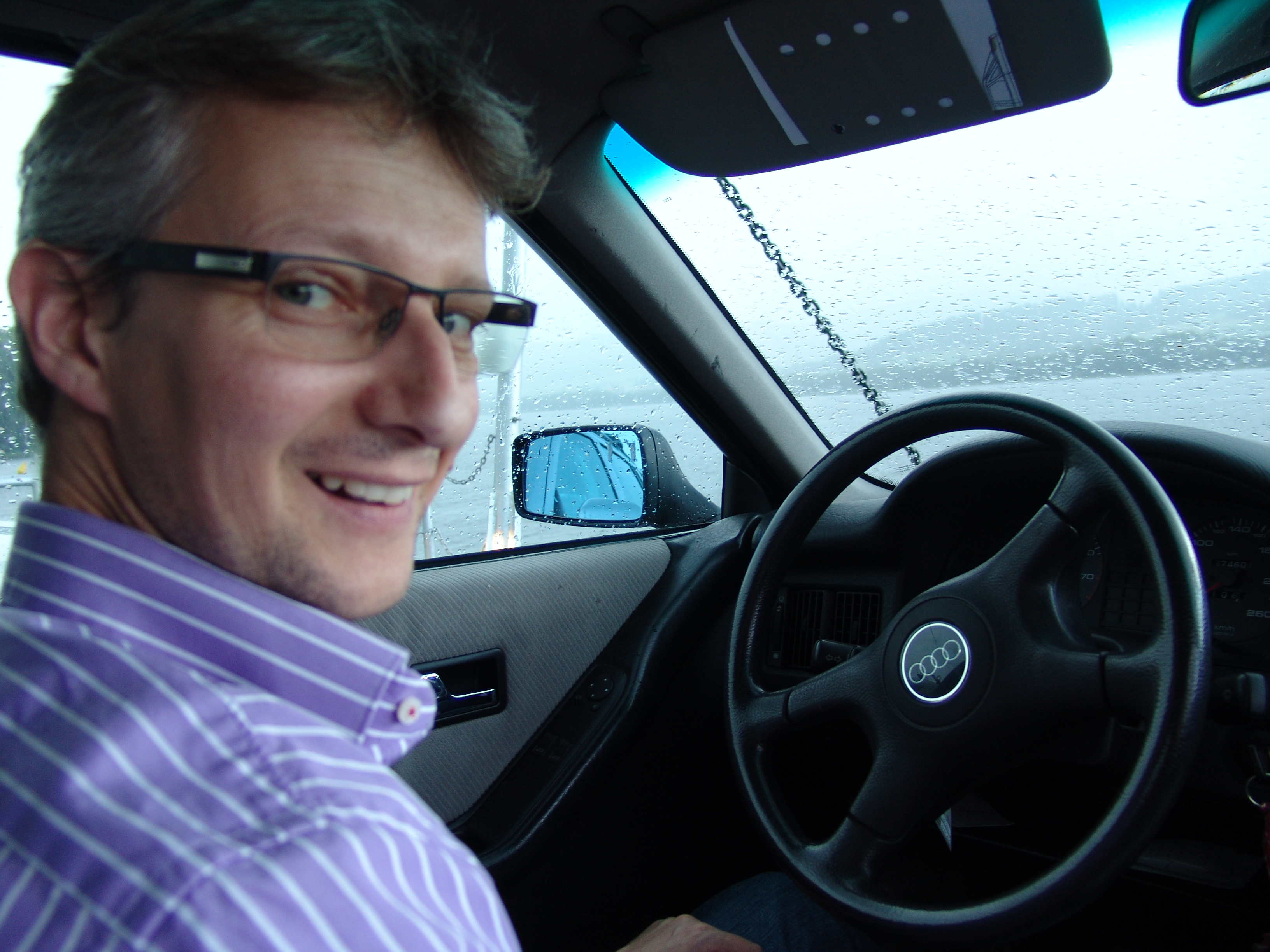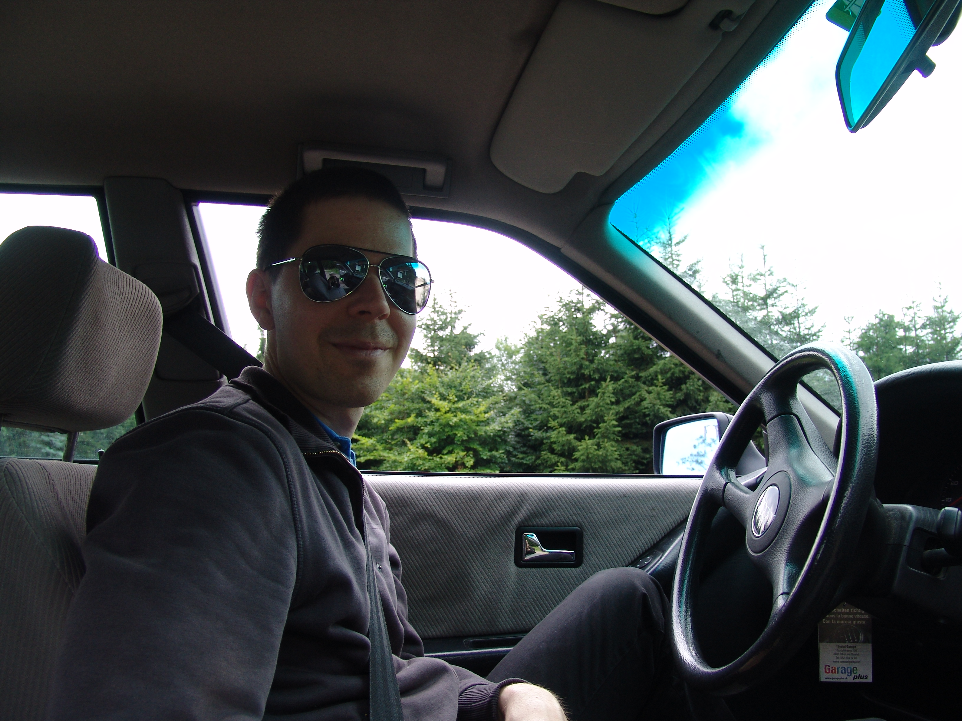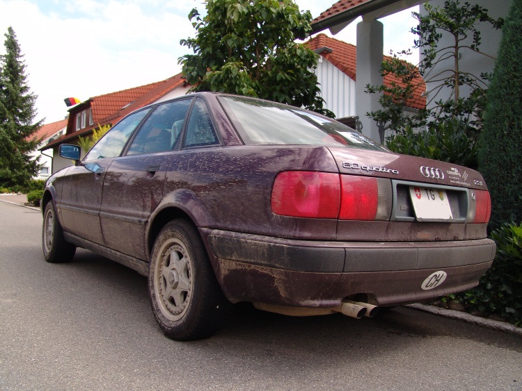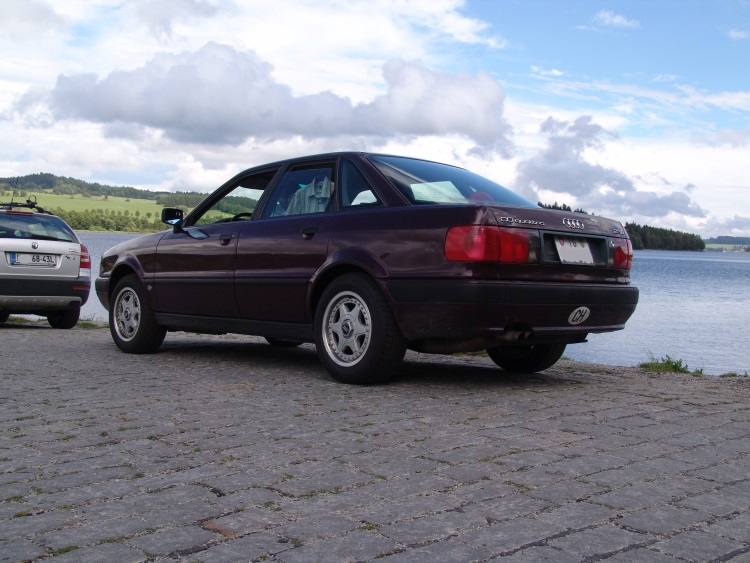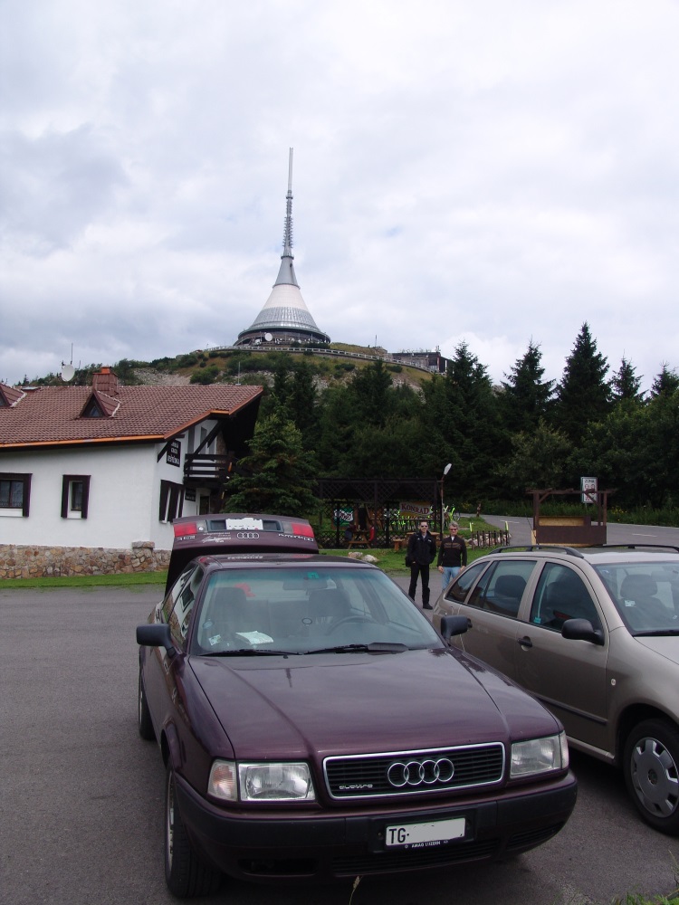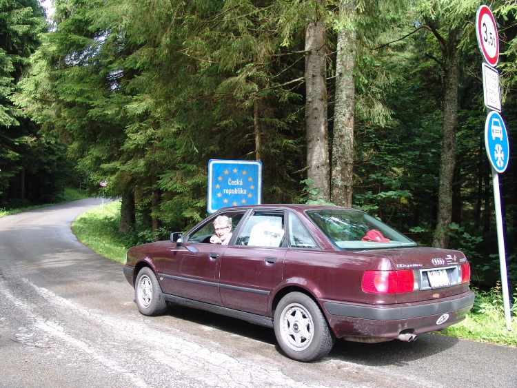 Auf der Cesky-Seite geht der Weg vielleicht noch 2 Kilometer, dann kommt man an einen kleinen See, welcher nur per Fähre zu überqueren ist. Zeit unser Urlaubsfahrzeug vorzustellen: Steffens low-budget Audi 80 quattro 2.3E mit dem 5-Zylindermotor, gegen Abgabe von zwei guten Weinflaschen und einer Hunderternote bekommen. Kein Sahnezustand, aber der Motor brüllt schön, der quattro-Antrieb bietet viel Freude auf den kurvigen Strassen des Ostens und der Verbrauch liegt mit um die 8l bei forscher Fahrweise mehr als im Rahmen.