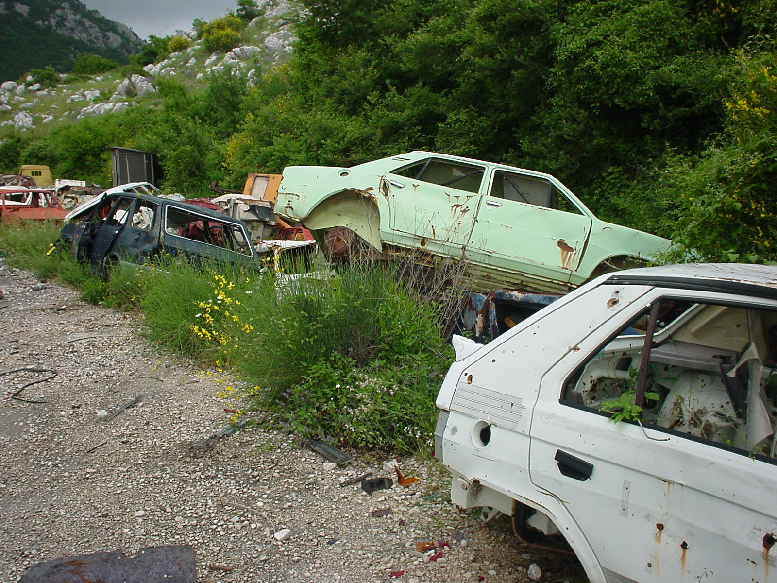 Südlich des Flughafens Richtung Montenegro auf einer Nebenstrasse, die Schrottautos schienen als Deckung während eines Gefechtes gedient zu haben. Was erkennen Sie alles für Autos?
