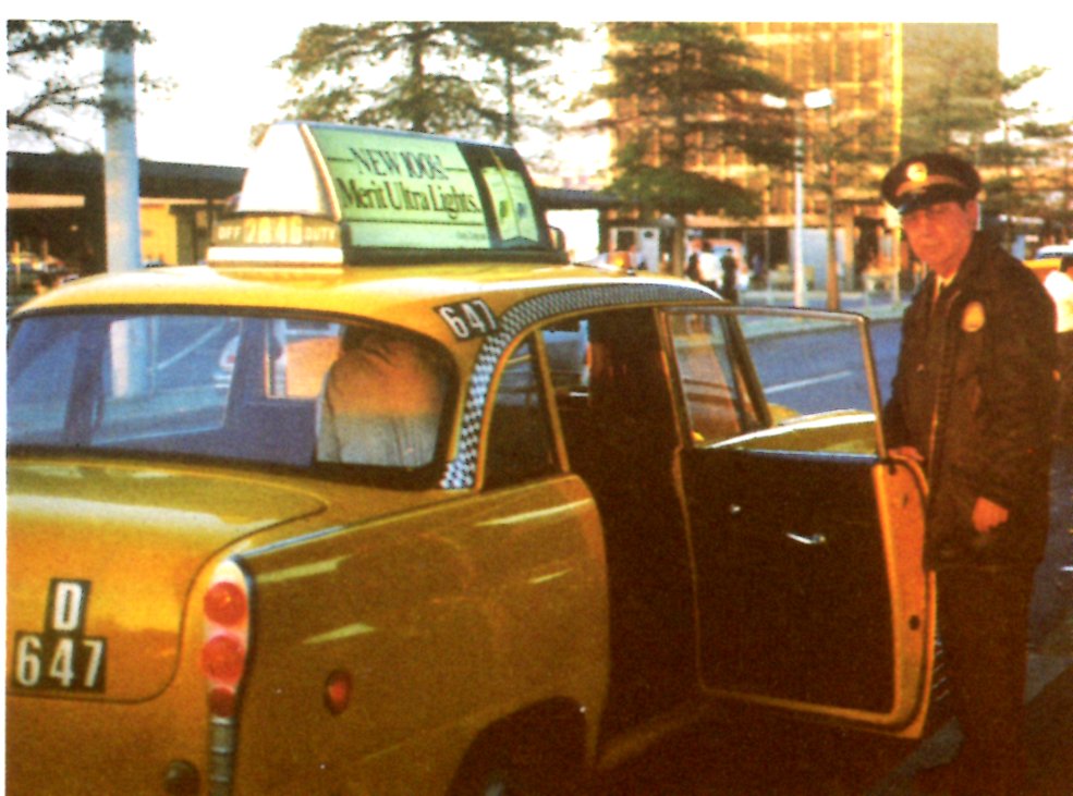 Checker Taxi mit einer Zigarettenwerbung, wir werden alle sterben! (kleine Korrektur, es handelt sich immerhin um Ultra Lights. Hoffe nur, die waren effektiver im Entgiften von Zigaretten als im kontrollieren der bereits in Verkehr gesetzten Vehikel)