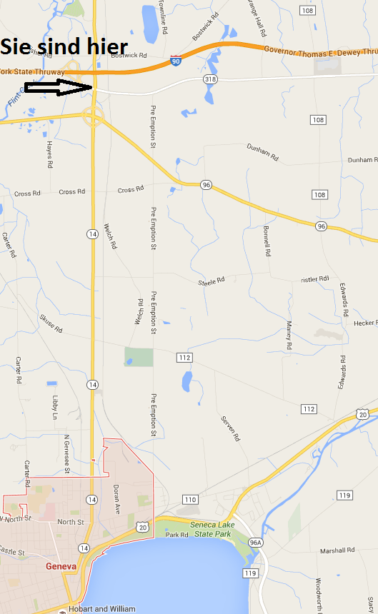 Dank moderner Technik kann man genau herausfinden, wo dieses Bild aufgenommen wurde. Wir haben soeben die Interstate 90 verlassen und müssen uns nun entscheiden wohin es weitergehen soll. Geradeaus kommen Sie über die 318er nach Auburn, wo Sie aber später noch auf die 20 East wechseln müssen, vergessen Sie das nicht. Links geht’s die 14 North hoch bis Lyons, rechts geht’s nach Geneva alias Genf am Finger Lake. Die europäischen Namen sind ja hier im Nordosten oft zu finden.
