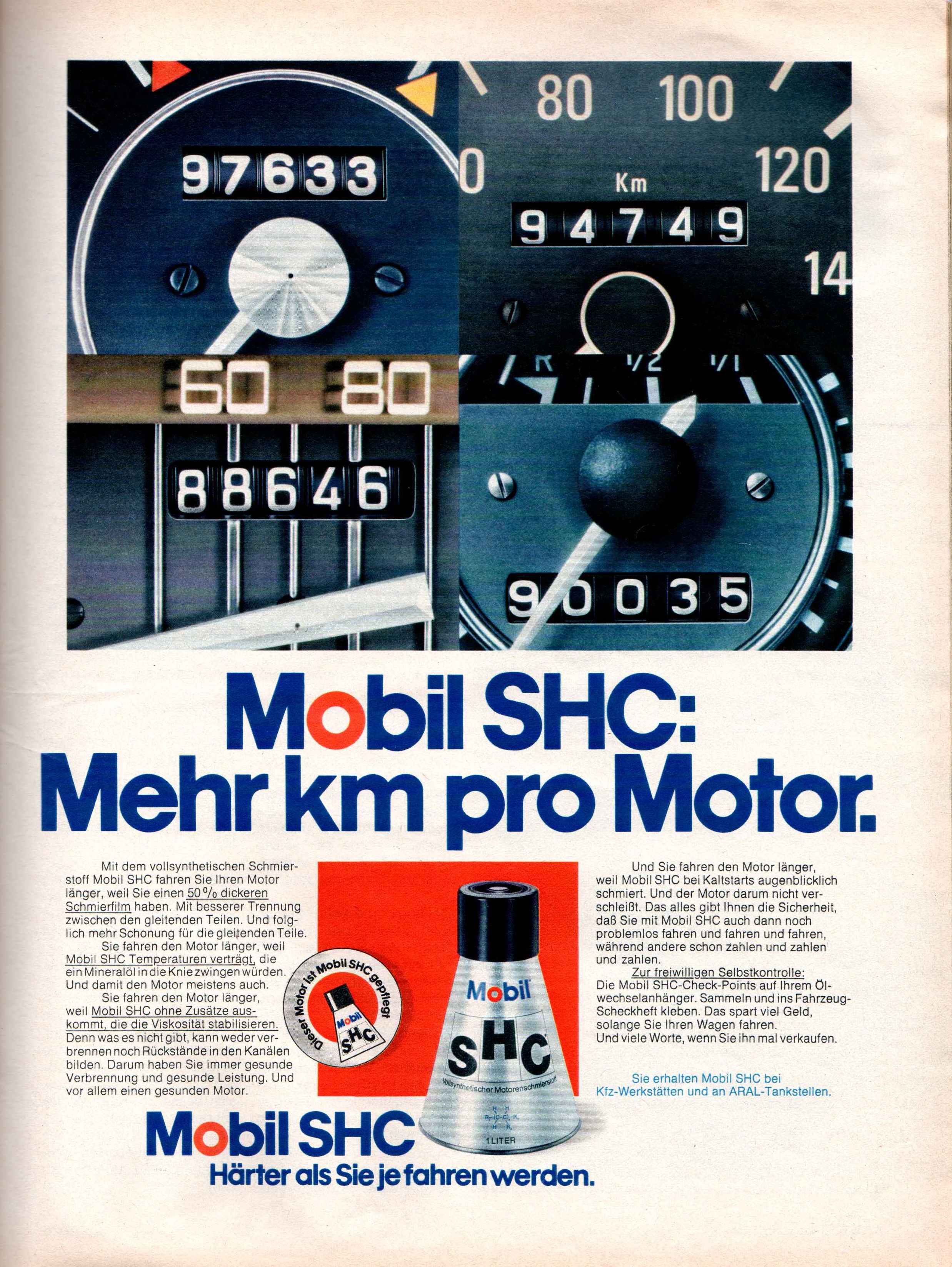 Dieses Werbeargument von Shell hat sich in Luft aufgelöst mit dem Long-Life-Service. Nun ist nicht mehr alle 5’000 oder 7’500km ein Ölwechsel fällig, was früher durchaus auch auf der Urlaubsfahrt eintreten konnte. Der Wagen und die Familie sind aber ein super 70er Jahre Klischee; bordeauxrote Lackierung, Schiebedach, Lammfellbezüge sowie eine Radioantenne. Dass die Kinder nicht korrekt mit Sicherheitsgurten angeschnallt gezeigt werden, wäre heute auch unvorstellbar. 🙂