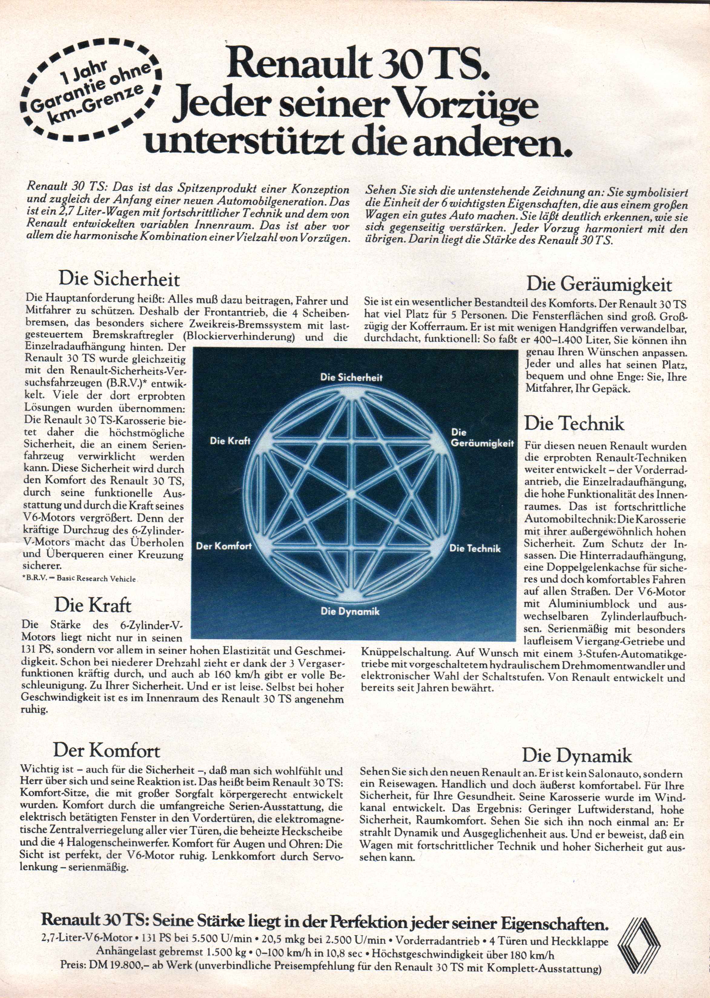 Renault 30 TS, die Mercedes-Alternative aus dem Land des „savoir-vivre“. Auch wenn die Marke oft schlecht wegkam in diesem Heft, welches vorallem den Stuttgarter Herstellern wohl gesinnt war; der französische Staatskonzern investierte in ein doppelseitiges Inserat.