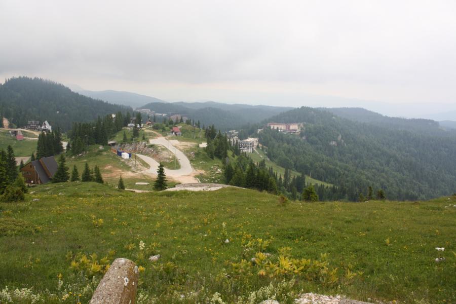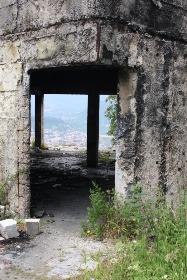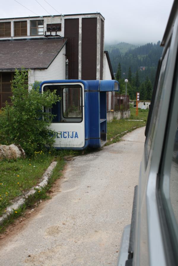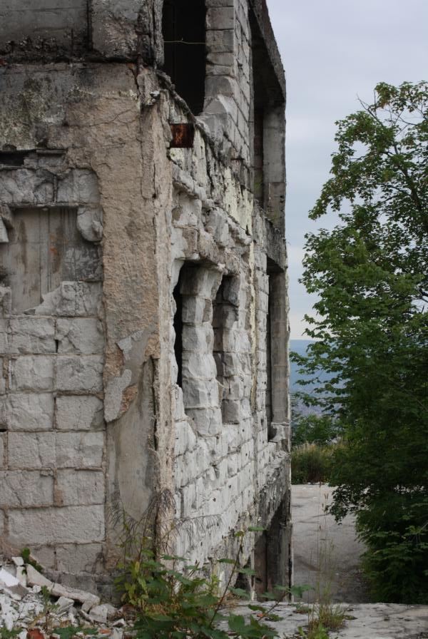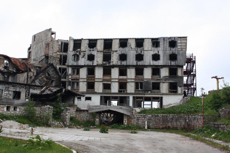 Wer dem morbiden Charme ausgebrannter und zerschossener Gebäude erlegen ist, kommt im ehemaligen olympischen Dorf oberhalb von Sarajevo voll auf seine Kosten. Meistens ist man dort ganz für sich alleine, nur selten verirrt sich ein Bautrupp hierher. Aber was wollen die Männer dort reparieren? Wir haben es nicht herausgefunden.