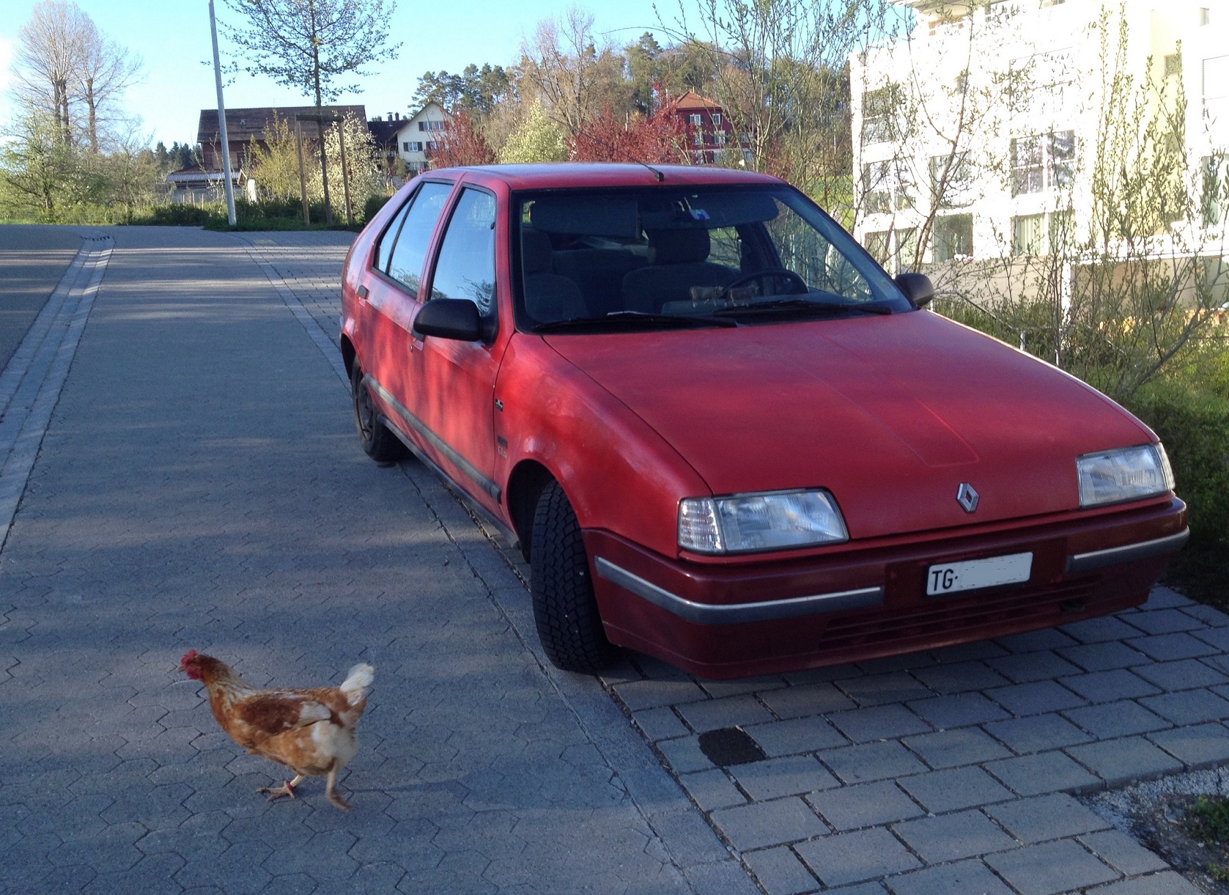 Renault R19, wann haben Sie den letzten gesehen? Ich kann mich erinnern, dass wir Anfang der 90er in Portugal in den Familienferien einen solchen in rot als Mietwagen hatten. Ob das Huhn jetzt auf einen Scheunenfund hinweist, oder dies nur ein Wink mit dem Zaunpfahl ist, überlasse ich dem werten Betrachter.