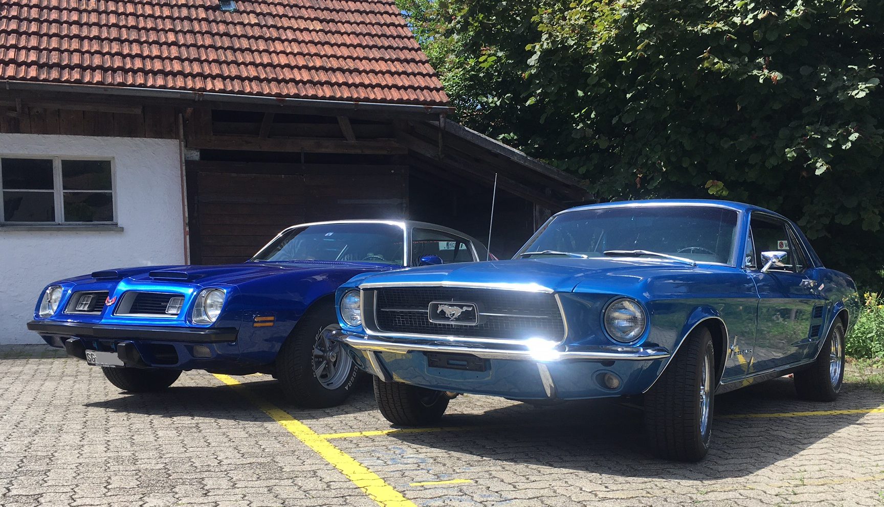 Die Grössenunterschiede zu den gewachsenen Pony Cars der siebziger Jahre sind nicht zu unterschätzen. Hier als Beispiel ein ’75er Pontiac Firebird. Auch die späten Mustang I Modelle ab 1969-73 sind deutlich grösser -> vor einem allfälligen Kauf die eigene Garage ausmessen! Ein Mustang I bis 1968 hingegen passt in fast jede europäische Normgarage.