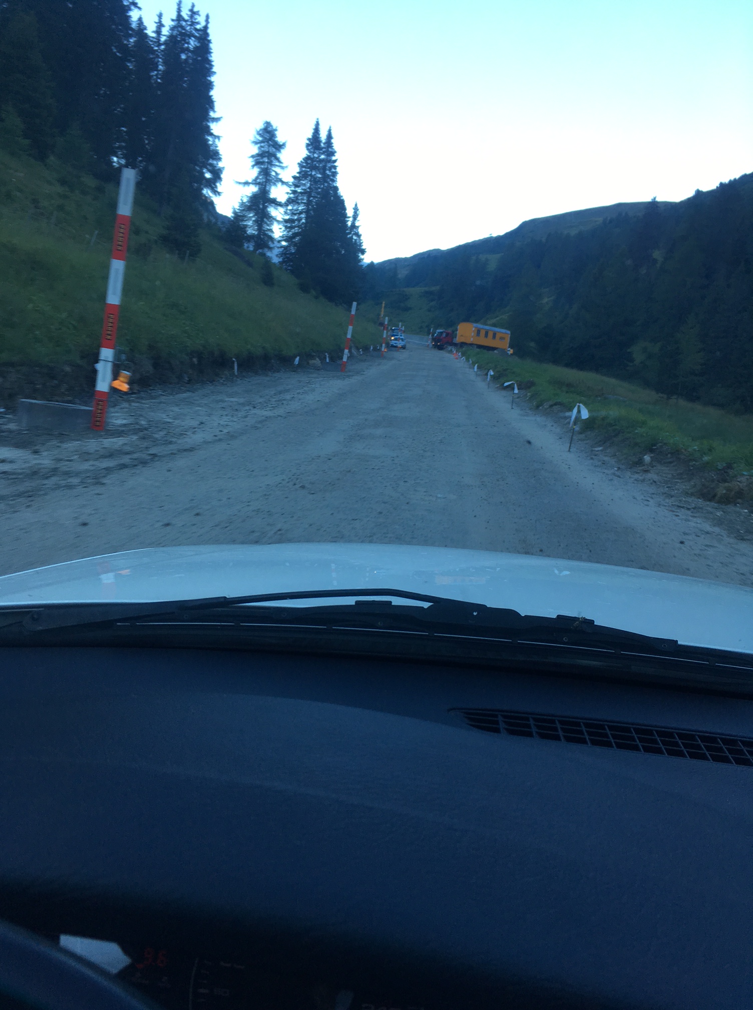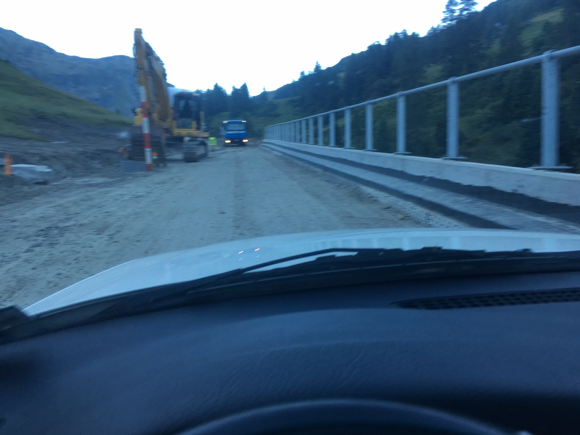 Taschentuch-Autos sind hier am falschen Ort, Baustelle auf Schweizer Seite mit etwas Geröll und engen Durchfahrten.