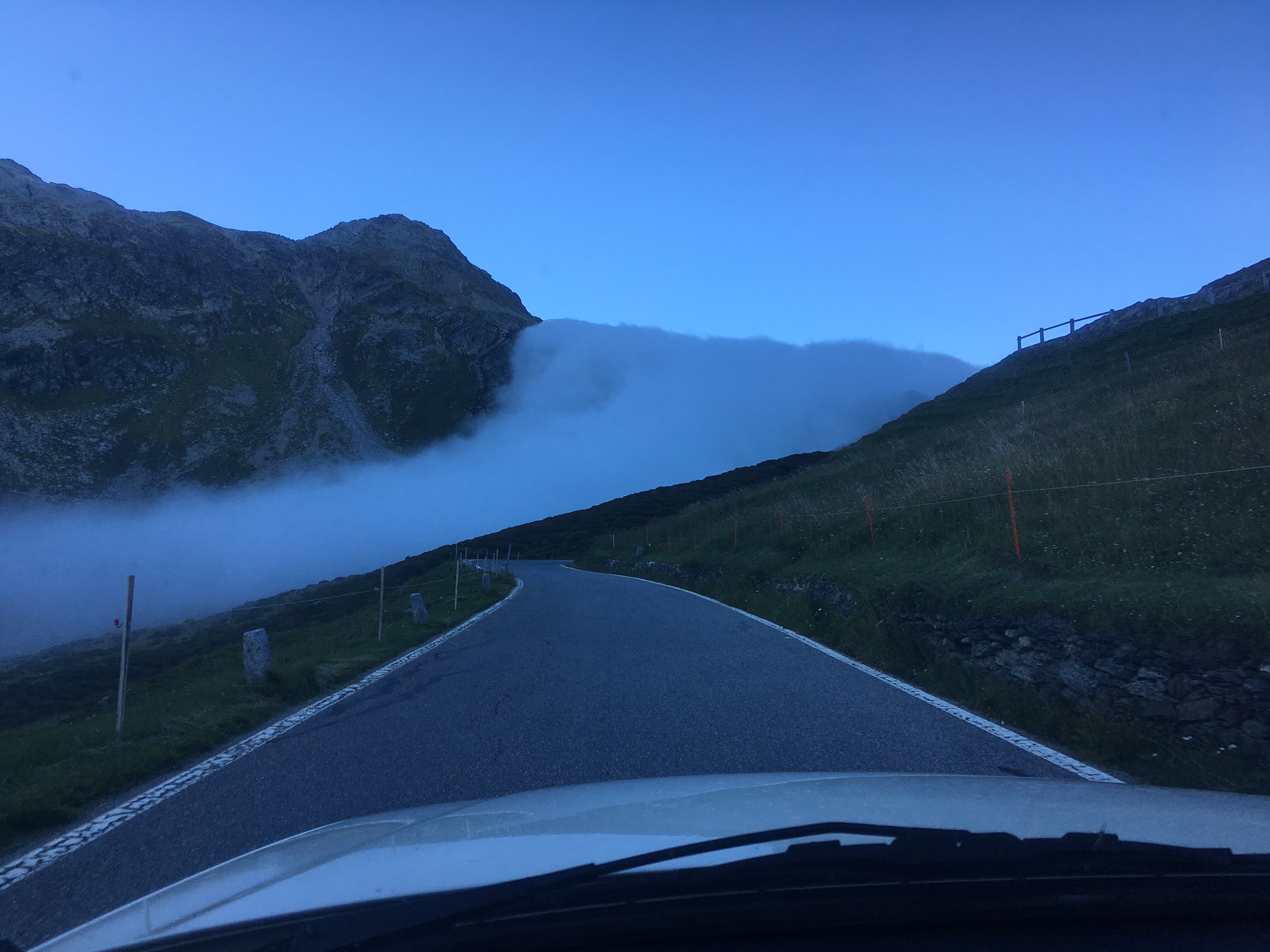Beeindruckende Nebelschwaden welche von der Passhöhe runterziehen Richtung Splügen.