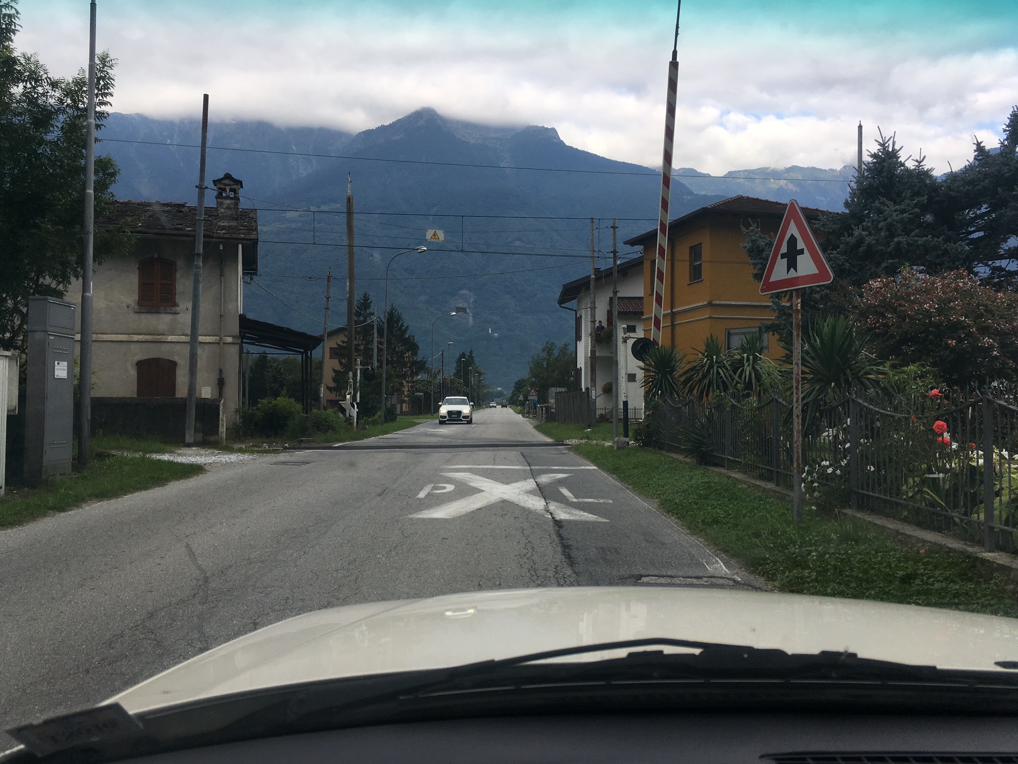 Ein Bahnübergang südlich Chiavenna wie in Jugoslawien, mit Drahtseilen zur Höhenkontrolle.