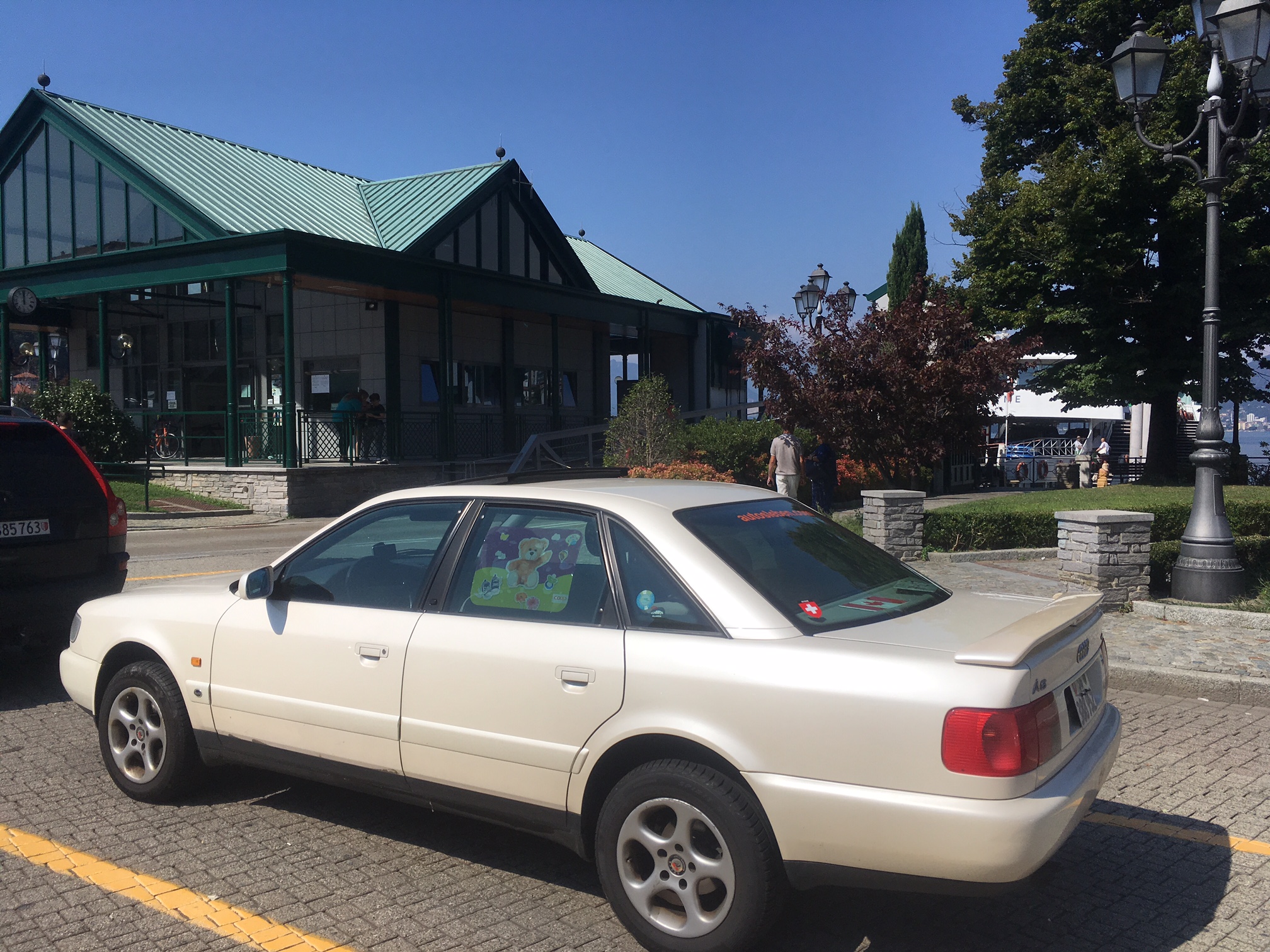 Warten auf die Fähre, das Ticket muss unbedingt im Voraus gekauft werden in dem im Hintergrund sichtbaren Häuschen. Der Billettverkäufer möchte genau wissen, was für ein Auto man habe, da die Preise nach Aussenlänge abgestuft sind. Auf mein „Audi cento (100)“ kam die Rückfrage „Audi ottanta (80)?“, „No CENTO!“ Damit hatte er irgendwie Mühe, mir wäre aber ein Kompromiss von Audi novanta (90) auch lieber gewesen, das käme günstiger. 🙂 (A6 wollte ich nicht sagen, sonst kriegt man ja vielleicht den Tarif für Überlänge der heutigen Dickschiffe)