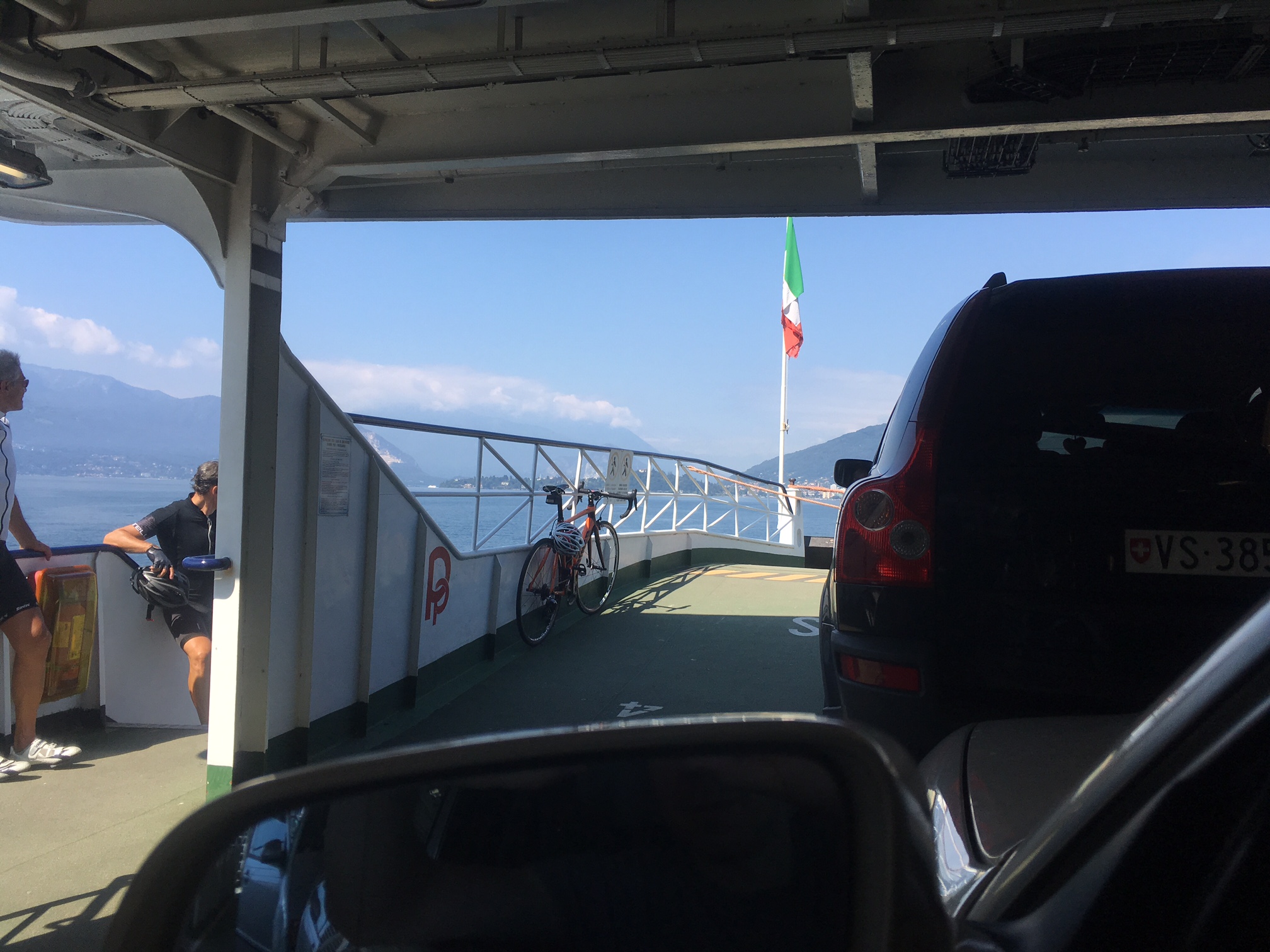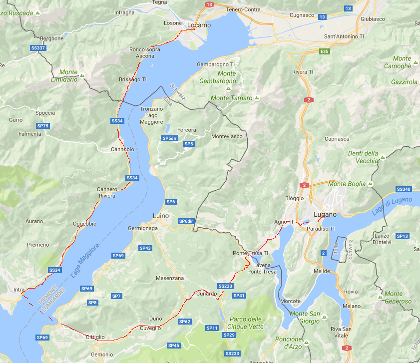 Grundsätzlich müsste der Artikel hier enden. Wenn man in Menaggio rechts abbiegt, ist man relativ bald am Lago di Lugano und damit auch schon fast im Tessin. Nun hatte ich aber Lust, das Ziel Brissago mit einem weiteren Umweg zu erreichen; via Ponte Tresa an den Lago Maggiore und mit der Fähre von Laveno-Mombello nach Intra überzusetzen. Danach sind es nur noch ca. 30 Kilometer zurück in die Schweiz Richtung Locarno.