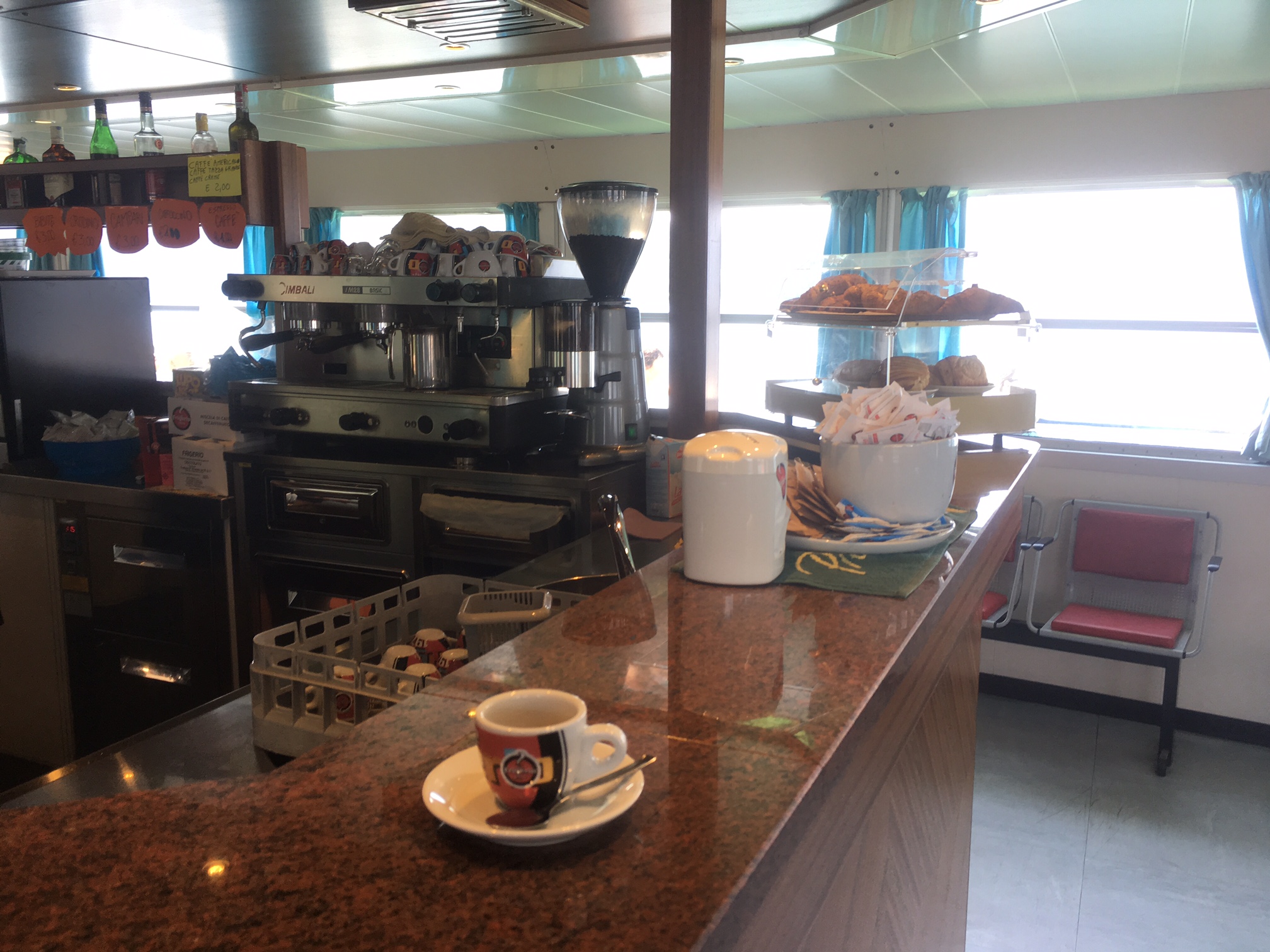 Kaffeebar wie in den 70er auf dem Oberdeck der Fähre. Auch hier, Espresso gibt’s für eine europäische Einheit.