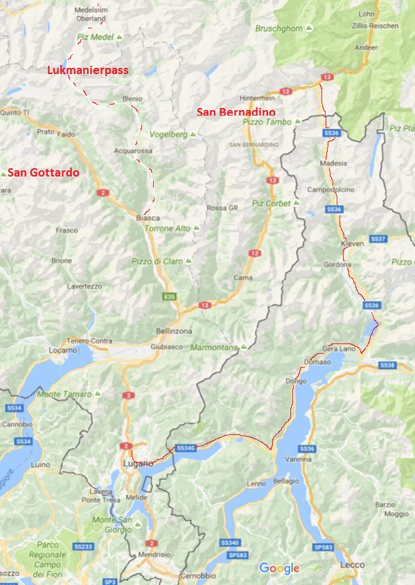 Diese Alternative via Italien steht allerdings nur im Sommer zur Verfügung. Mit roter Linie ist die Splügenroute eingezeichnet, rot gestrichelt die Variante über den Lukmanier. Der in der Karte mit „Kleven“ bezeichnete Ort ist besser bekannt als „Chiavenna“. Google Maps verwendet die politisch unkorrekte Form aus der österreichischen Zeit im 19. Jhd. Quelle des Bildes: Google Maps.