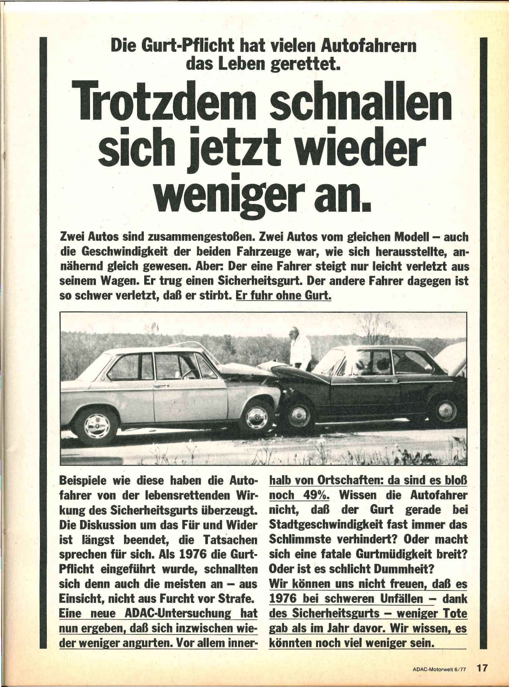 Die Einführung der Gurtpflicht war kein Spaziergang, obwohl sich der ADAC damals sehr dafür einsetzte. (und wohl damit auch einige Leben dank Aufklärung zu retten vermochte)