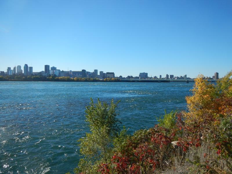 Nach der Umrundung der Strecke kann man sich am Ufer des Sankt Lorenz Stroms ausruhen und den Blick auf die Skyline und den Hausberg Mont Royal genießen.
