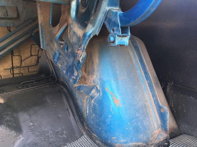 Wer auf Grund der vielen kleinen Mängel gedanklich noch nicht Abstand von diesem Wagen genommen hat, bekommt im Kofferraum ein paar weitere Argumente geliefert. Offensichtlich stand der Wagen vor der Restaurierung lange Zeit ungeschützt im Freien und war Wind und Wetter ausgesetzt. Warum man so viel Aufwand in eine Restaurierung steckt und dann den Kofferraum nicht reinigt und die verrostete Hutablage instand setzt, wird wohl nie beantwortet werden können. Wie es dann unter dem neuen Teppich im Innenraum aussehen mag, lässt sich nur erahnen.