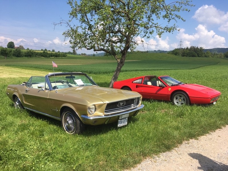 Wo sieht man schon einen alten Mustang neben einem alten Ferrari auf der Wiese stehen?