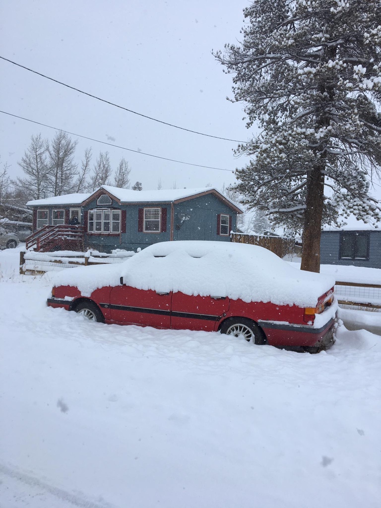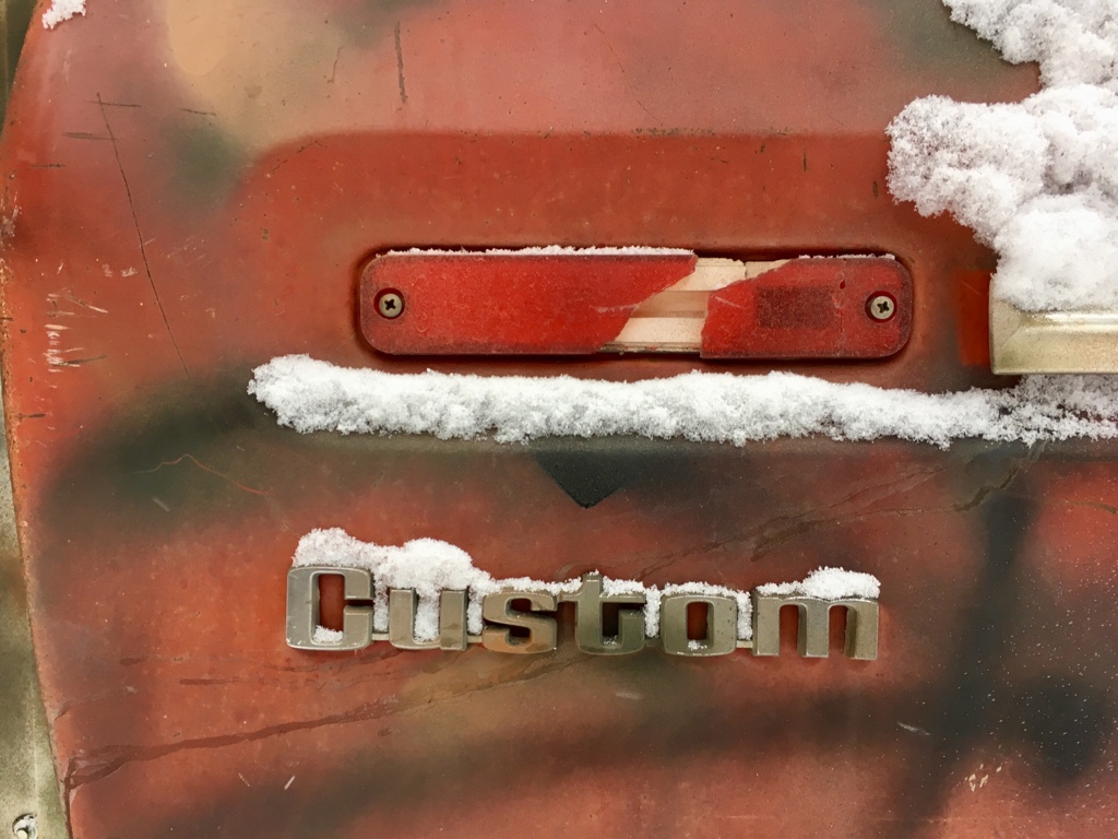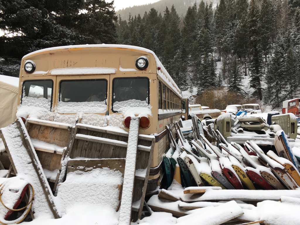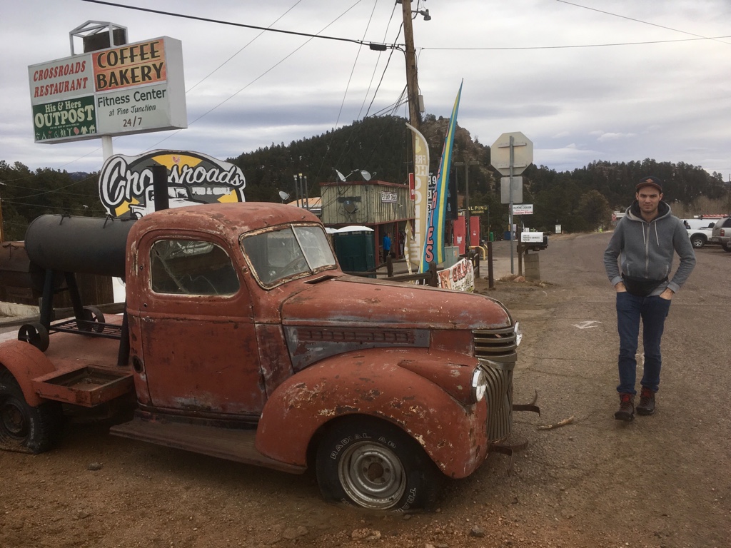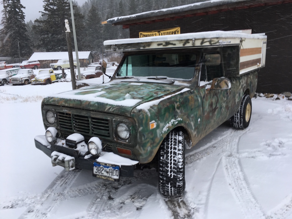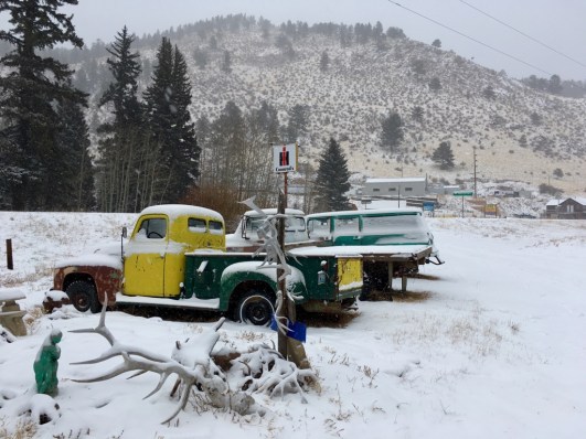 Kurz nach diesem Bild fing es an zu schneien, nicht ein bisschen sondern richtig, das bei Temperaturen um -10 Grad, wir brauchten uns keine Sorgen über Matsch zu machen. Als wir es uns so wohlig warm im Auto eingerichtet haben mit Sitz- und Lenkradheizung sahen wir einen Schrottplatz. Erst auf den zweiten Blick war uns klar, dass das ein sortenreiner Schrottplatz ist von Fahrzeugen der Marke „International„. Wir klopften an um zu fragen, ob eine Begehung mit Fotoapparat erlaubt sei. Wir wurden sogleich hereingebeten und einen Augenblick später hatten wir beide eine Tasse heissen Kaffee in den Händen. Dabei erzählten uns die beiden Herren die Geschichte dieses Schrottplatzes. Der Ältere der beiden arbeitete im Werk in Chicago bis 1980. Danach mit dem Ende der Autoproduktion siedelte er um nach Colorado und transportierte seine bisherige Teilesammlung in 4 Schulbusladungen. Bis jetzt kauft er mit einem jüngeren Angestellten laufend Autos auf und schlachtet diese. Teile können bei ihm gekauft werden, aber nur analog. Er ist per Post und per Telefon erreichbar, Computer gibt es in diesem mit einem Kohleofen beheizten Schuppen nicht. Für uns war es eine Zeitreise, im alten Röhrenfernseher welcher noch mit Zierholz eingekleidet war, lief ein alter Western bei gefühlten 30 Grad dank des Ofens. Uralte Kühlschränke ebenfalls von International dienen ihm bis heute. Der fleckige Scout ist ein Alltagsauto.