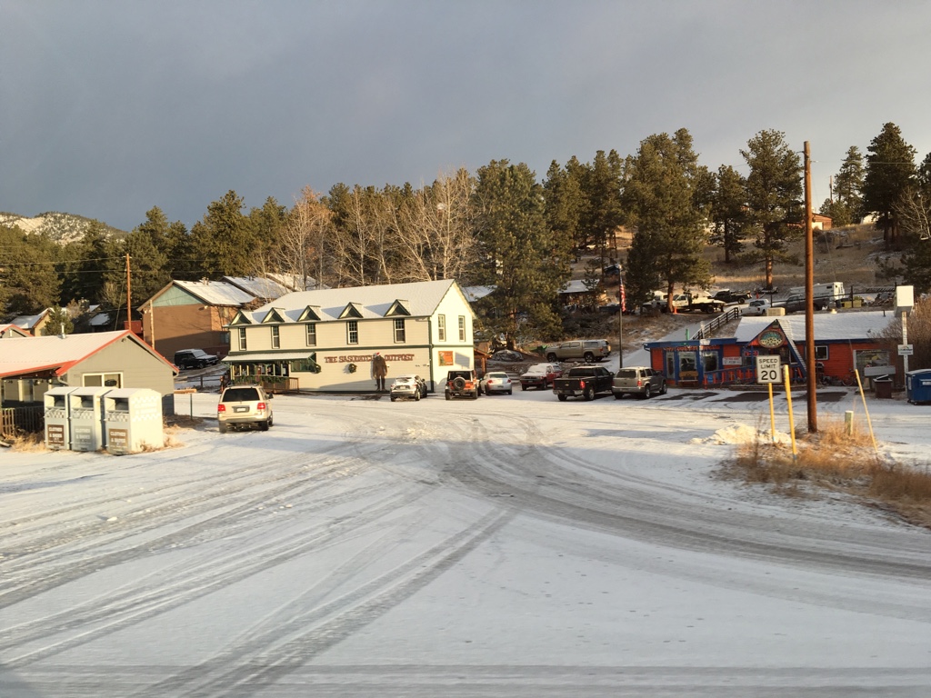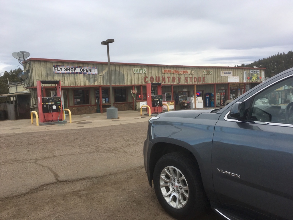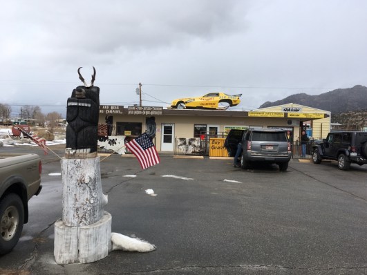 Nach den gut 3000m Meter Meereshöhe führt die 285 wieder ins Tal nach Johnson Village wo nur wenig Schnee lag. Dieser Laden hier bietet Modellautos, die Schmückung verspricht aber mehr als das Angebot im Haus.