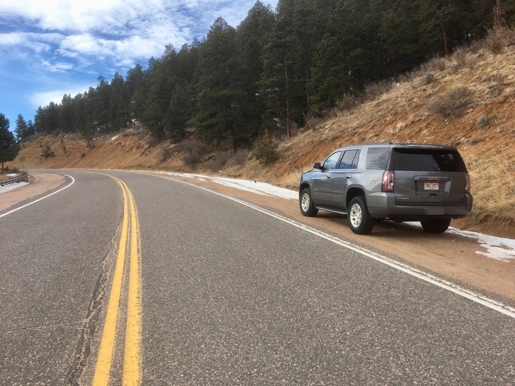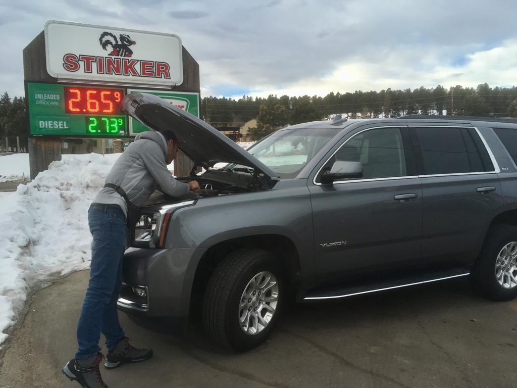 Kurz nach Denver auf der ersten Anhöhe machten wir kurz Rast. Mein Freund und Mechaniker wollte sich aufgrund des sehr dezenten Sounds davon überzeugen, ob da wirklich 8 Zündkabel vorhanden sind. Dass wir bei Stinker hielten, bemerkte ich erst beim Betrachten der Bilder. Meines Wissens verfüg der GMC selbstverständlich über eine zeitgemässe Abgasreinigungsanlage. Aufgrund der einfachen Konstruktion dieses Saugmotores nehme ich an, dass seine Abgaswerte zu den besseren gehören. 🙂