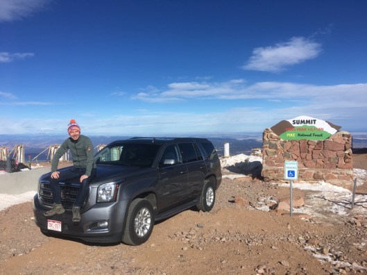Nein, normalerweise stehen wir nicht auf dem Behindertenplatz (normalerweise ist das Vorkommen von Parkplätzen auf 4300m über Meer sowieso unwahrscheinlich), das Foto aber musste sein. Es handelt sich hier um ein klassisches Angeberphoto, wir haben nichts gemacht als an einem stark servounterstützen Lenkrad gedreht und etwas Gas gegeben. Für Schweizer mit Bergerfahrung wahrlich kein Ding. Aber wenn man es schonmal auf den Pikes Peak schafft, ist Jungs dieser Übermut zu verzeihen.