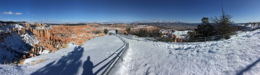 Erstes Etappenziel ist heute der Bryce Canyon N.P. Hier gibt’s Frühstück und eine kurze Besichtigung. Der Grossteil des Parks ist geschlossen, nur die untersten Aussichtspunkte „Inspiration Point“ sowie der „Bryce Point“ sind offen, die Strasse weiter hoch Richtung „Rainbow Point“ ist nicht geräumt. Allerdings bieten schon die unteren Aussichtsplätze eine tolle Sicht, das rot-braune Gestein in Kombination mit Schnee hat schon etwas von einer Traumwelt.