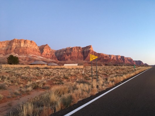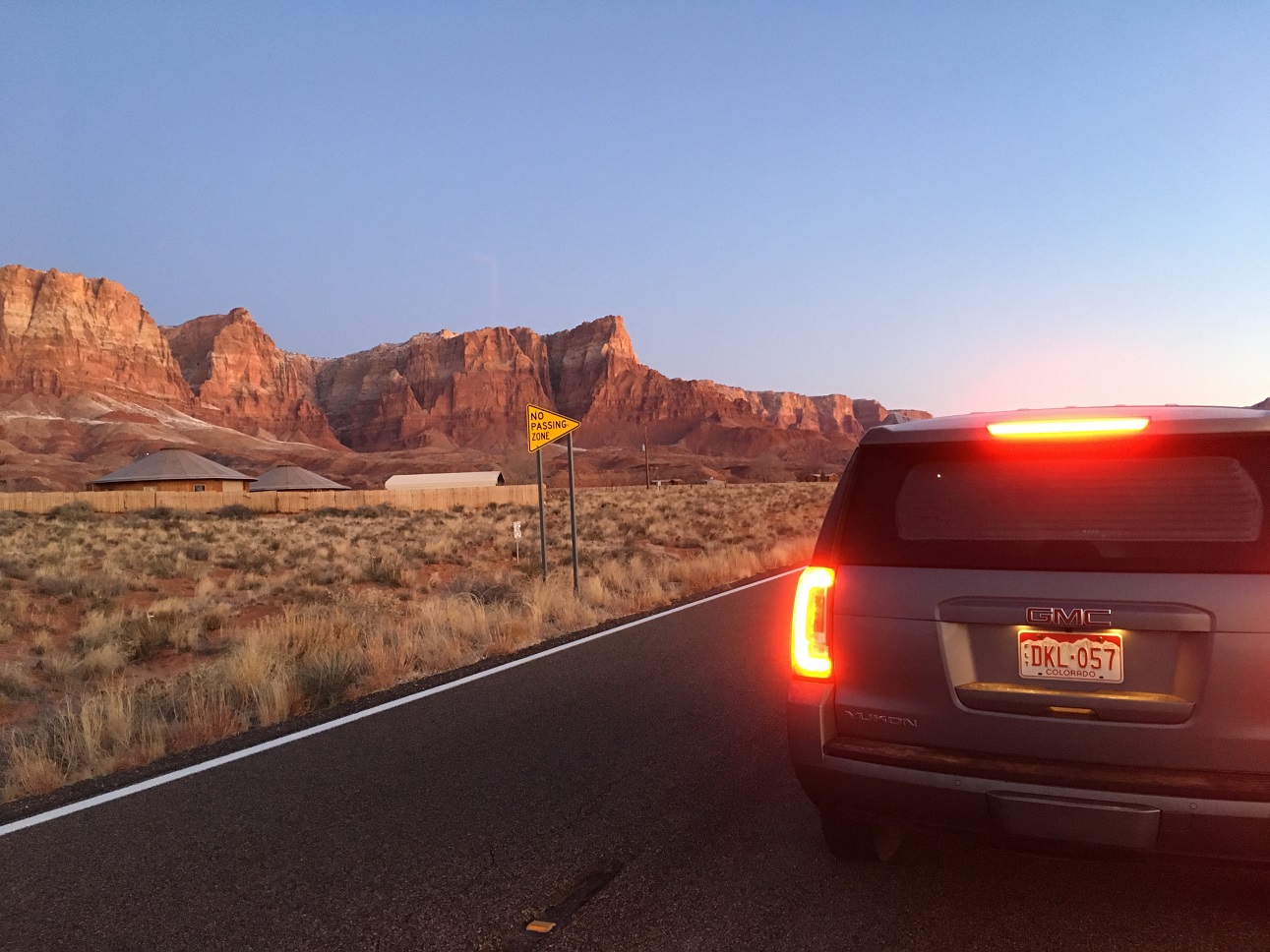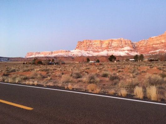 Hab ich schon erwähnt, dass mein Begleiter an der Fahreritis leidet? Wenn er mal fährt und unterwegs ist, dann macht er am liebsten die restliche Strecke am Stück, auch wenn man dafür 10 Tage Zeit hat. So hatte ich schlechte Argumente mit dem Wunsch noch in Kanab oder Fredonia eine Unterkunft zu suchen. Im Nachhinein muss ich ihm beipflichten, einen so schönen Sonnenuntergang in der verschneiten Wüste habe ich noch nie gesehen.