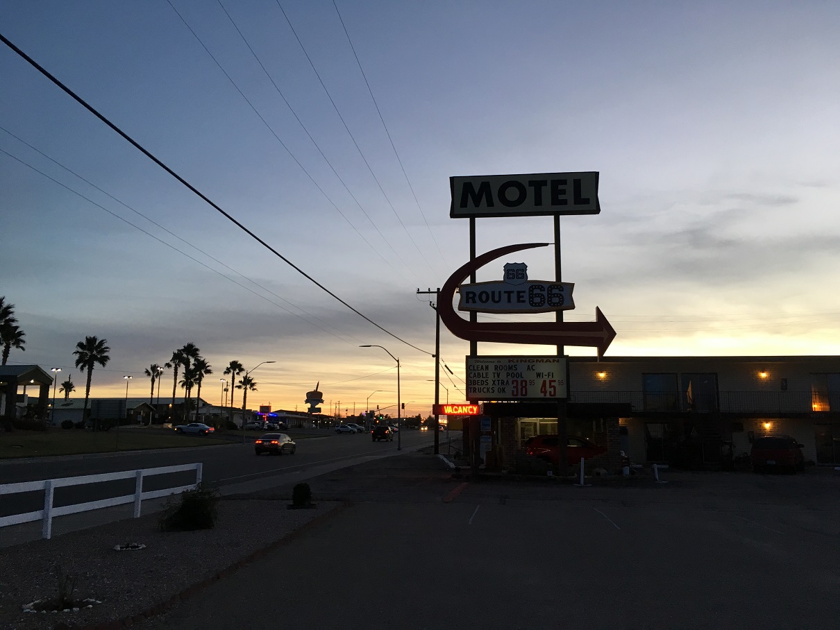 Unser Motel in Kingman AZ, ja es war kultig. So kultig, dass sich nachts ein Teil der Feder durch den verbrauchten Matrazenbezug in meine Rippen bohrte. Eine Schnellreparatur meines mitreisenden Mechanikers erster Wahl half nichts, er sollte wohl besser bei Fortbewegungsmitteln bleiben. 🙂