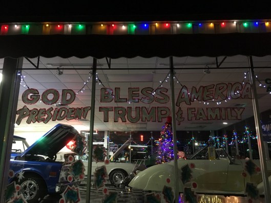 Ungewohnter Weihnachtswunsch eines Klassikerhändlers gleich gegenüber.