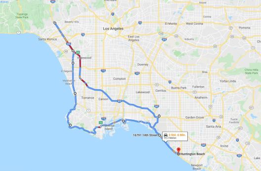 Auf dieser Karte sieht man unsere Tour am ersten Tag. Erst ein Abstecher nach Norden wo wir einen Mustang I besichtigen, danach holen wir den Camaro in Flughafennähe, bringen danach den GMC Yukon bei Hertz in LAX Airport zurück und holen auf dem Heimweg nach Huntington Beach noch die gemietete neue Corvette C7 ab.