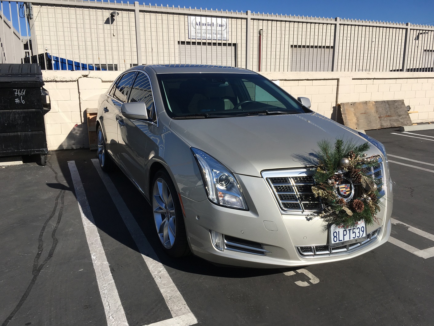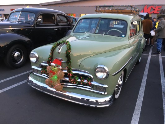 Beim Warten auf den Verkäufer des 68er Mustangs fotografiere ich einen klassischen amerikanischen Weihnachtsschmuck am Auto. Über mangelnde Kühlluft macht sich hier niemand Sorgen.