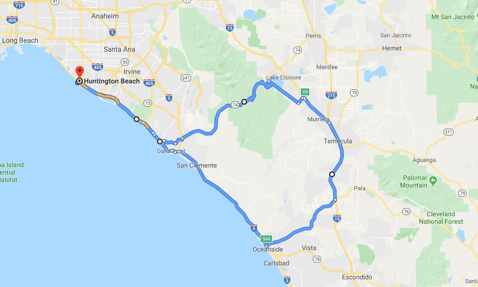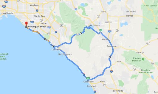 Heute geht es erst zu Classic Industries, unserem Lieferanten für diverse Ersatzteile welcher seinen Shop ebenfalls in Huntington Beach hat. Danach fahren wir südwärts aus der Stadt hinaus bis Dana Point und von dort aus den Canyon hoch Richtung Lake Elsinore. Von dort aus über die Interstate 15 südwärts und dann über die 76er wieder an den Pazifik in Oceanside. Von hier aus müssen wir nur noch nordwärts fahren auf dem Highway 1 zurück bis nach Huntington Beach.