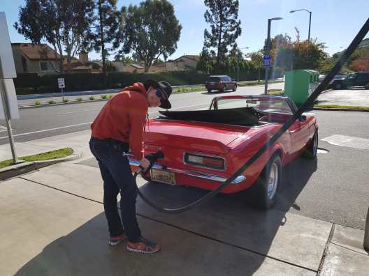 Ich weiss, meine Wenigkeit sieht etwas unentspannt aus. So toll auch Tankstutzen am Heck des Fahrzeuges aussehen, das Betanken mit dem dauernden Halten der Pistole ist tatsächlich etwas verkrampft. Getoppt wird dies aber bei meinem 2nd gen Firebird von 1975, bei welchem sich der Tankstutzen hinter dem Kennzeichen befindet, welches mit starken Federn dauernd wieder in Normalposition möchte. Aber wie immer bei Amis, nimm es mit Humor und alles ist gut.
