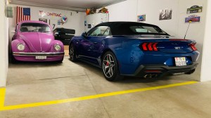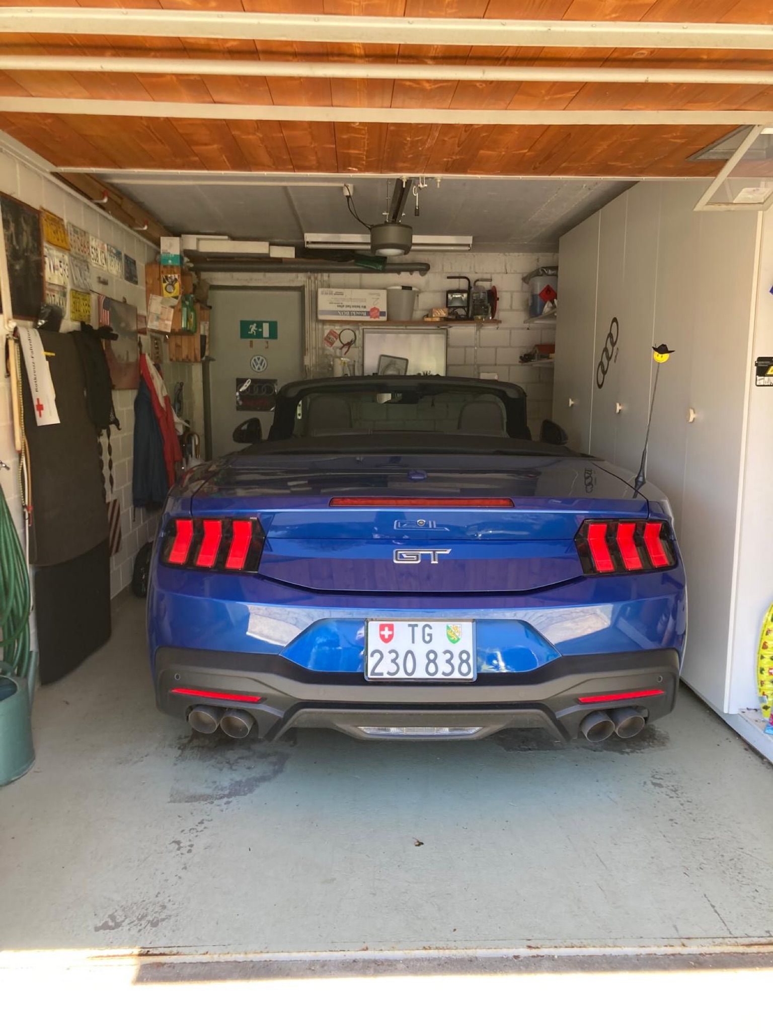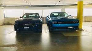Bevor die Wahl endgültig auf den neuen Mustang gefallen ist, habe ich mir auch den Camaro und den Challenger angesehen. Beides auch sehr interessante Autos, über den Camaro ZL-1 folgt hier noch ein Bericht in nächster Zeit. Für mich persönlich war der Camaro innen aber zu eng und dunkel. Der Challenger hingegen zu breit für Schweizer Strassen, daher fiel die Wahl auf den zierlichen aber innen hellen Mustang. Hier zu sehen in einer Einzelgarage aus den 70er Jahren, er passt problemlos in solche Normgaragen.